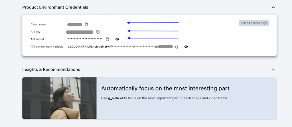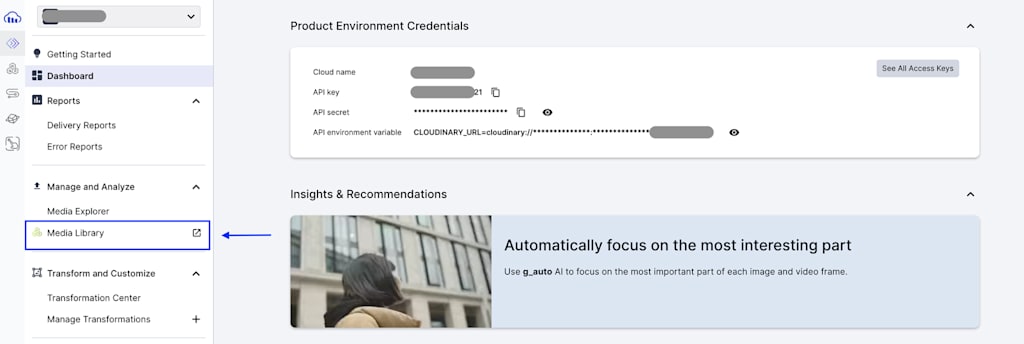 Log in to your Cloudinary dashboard to retrieve product environment credentials such as the Cloud name, API key, and API secret.