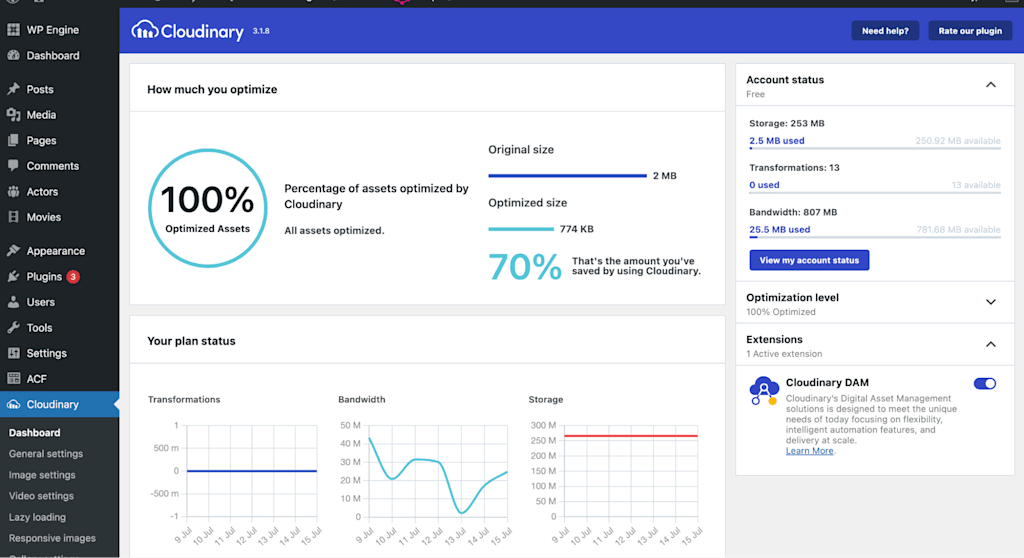 - Go to the Cloudinary settings page in your WordPress dashboard and enter your Cloudinary API credentials (found in your Cloudinary dashboard).