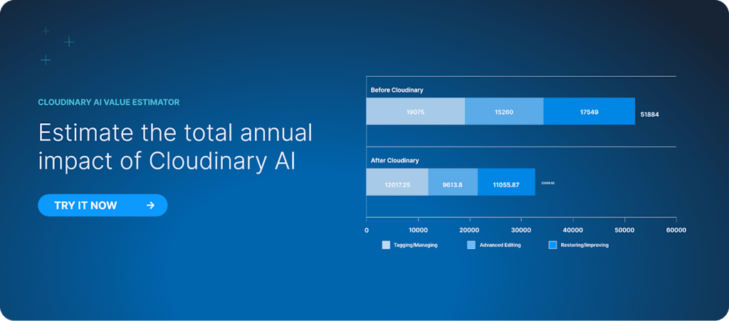 We are proud to launch our new generative AI calculator. Based on real research from leading organizations and academic studies, this tool allows you to easily calculate the amount of time you can save per employee or organization using Cloudinary’s generative AI. Enter the number of employees performing manual, repetitive tasks to see potential time and money savings.
