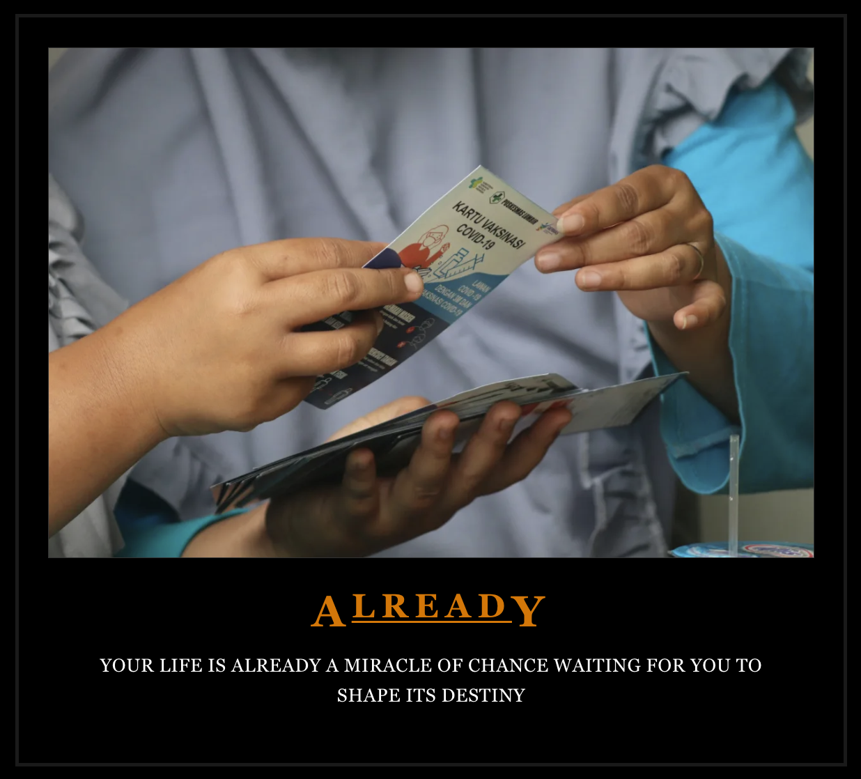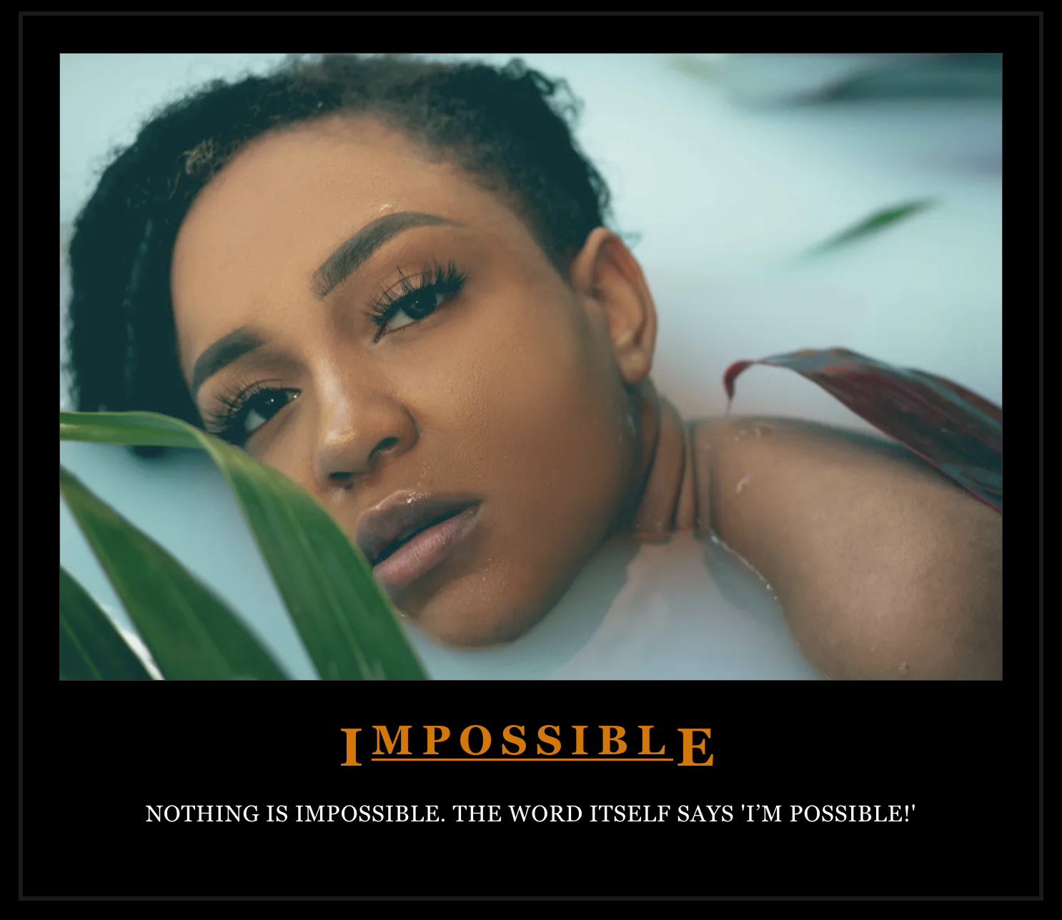 We’ll grab one of the pithy affirmations from the API, extract the longest word as the central message to display with plenty of kerning, and then send that word to Unsplash to find a match. Store the image returned in Cloudinary and display the lot a as a printable poster, as a stacked image, word, and affirmation on a black background, like this one: