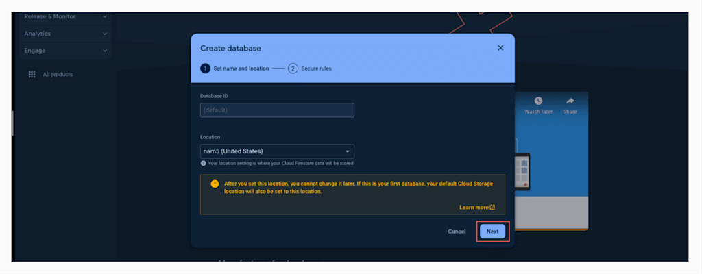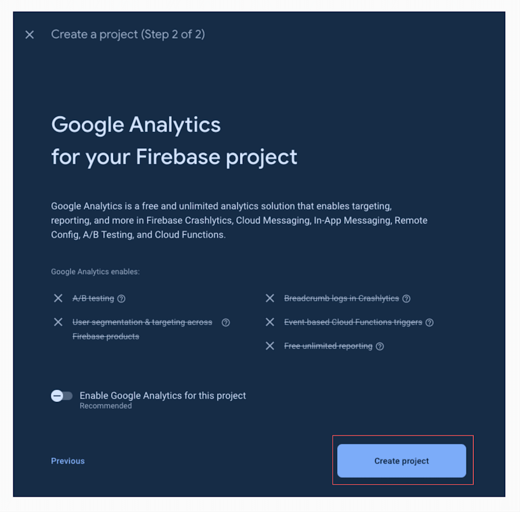 Enabling Google Analytics on your project is optional. I disabled it. Then click Create project.