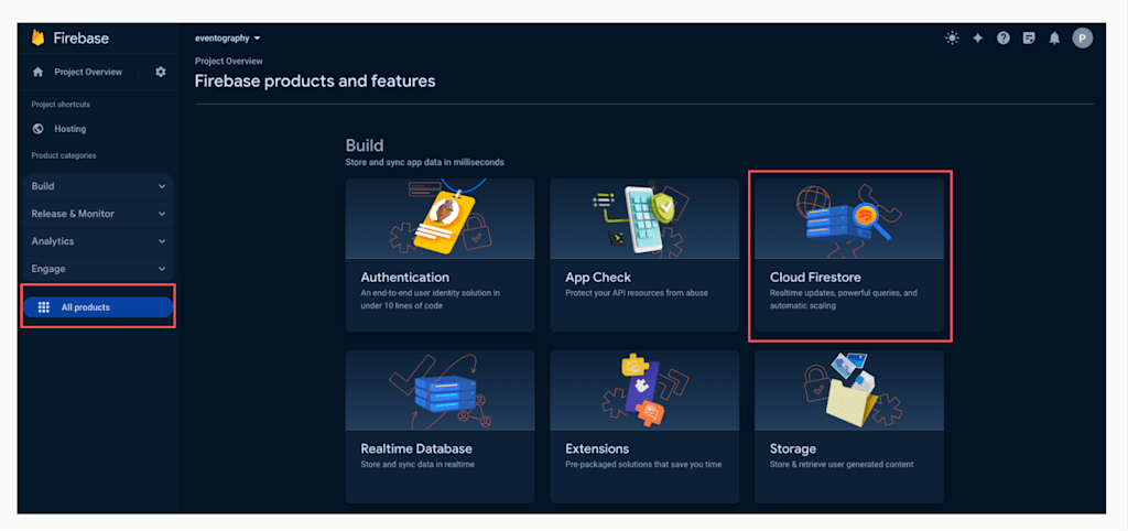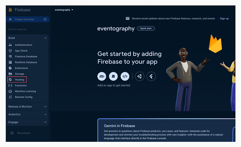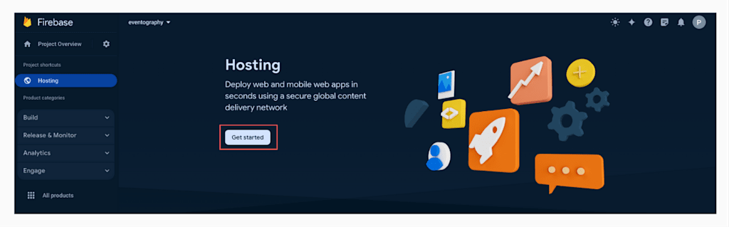 Inside the Firebase console, on the left-hand panel, click Hosting.