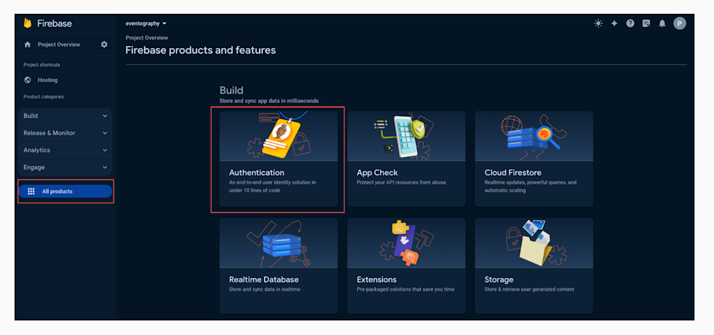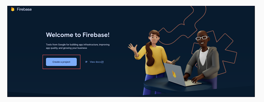 To begin, log in to your Firebase account or create a free account. Then, click Create a project to configure your Firebase project.