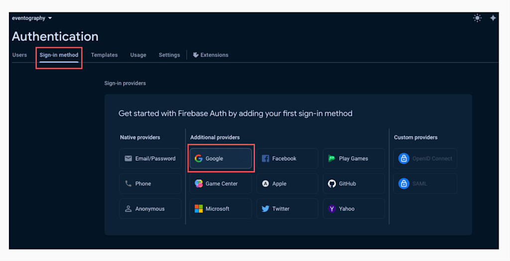 On the Authentication page, click Get Started. Go to Sign-in method and select Google. You can add different sign-in methods, but for this app, we’ll only do Google.