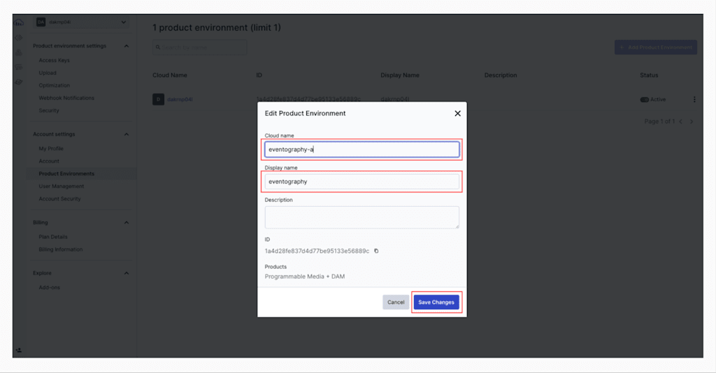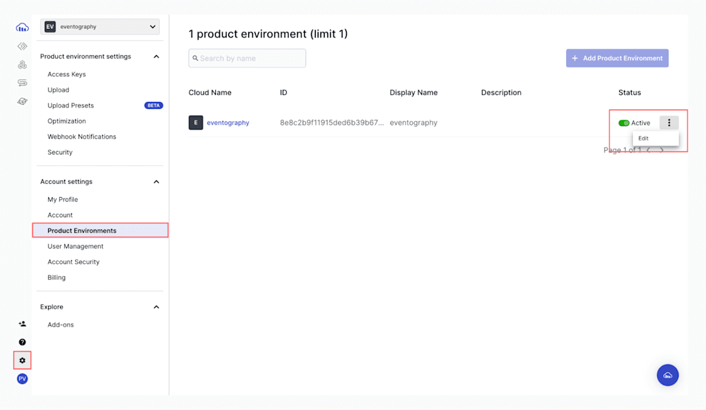 In your account, select Settings > Product Environments. Here you’ll see the cloud that you created. Let’s click the three-dot menu to edit your Cloudinary Cloud Name.