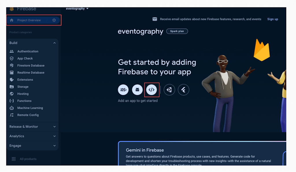 In your Firebase Console, click Project Overview on the left-hand panel, and select Web.