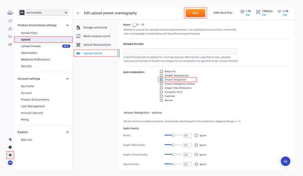 In your preset, click Upload Control, and in the Auto moderation section, selectAWS Rekognition. You can adjust the confidence level, but I’ll leave the default settings as 0.5. After configuring your preset, click Save.