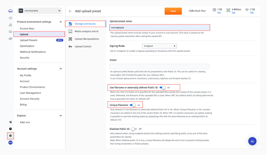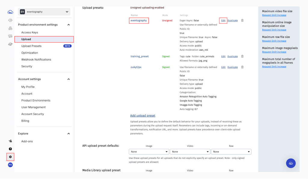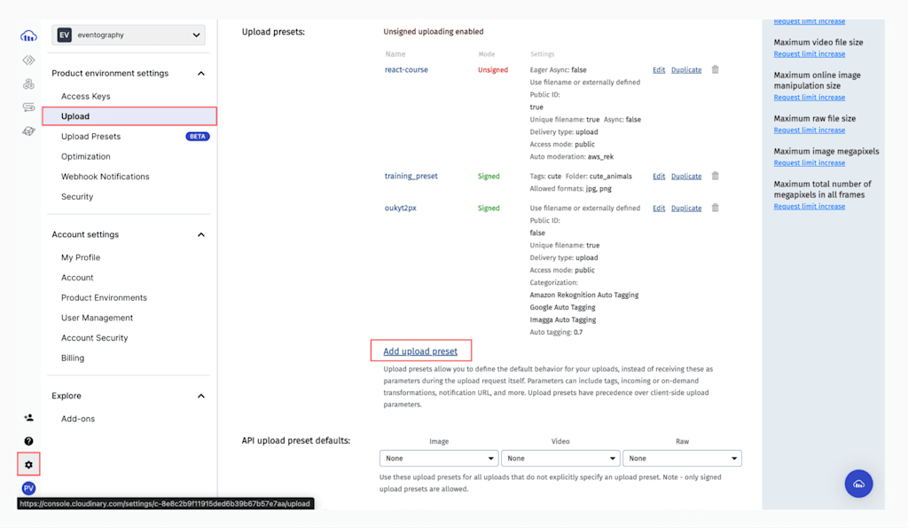 To create your first preset, go to Settings > Upload, then click Add Upload preset.