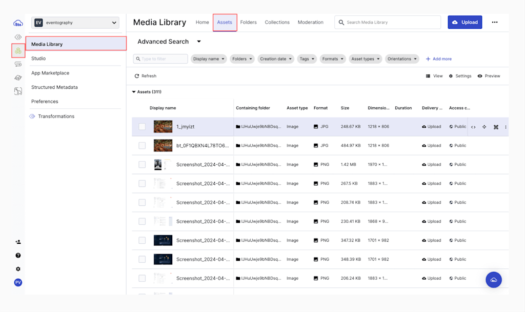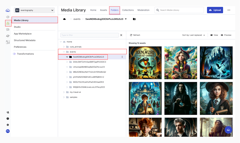 To see the assets by event ID, click Digital Assets Management > Media Library > Folders.