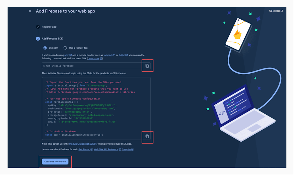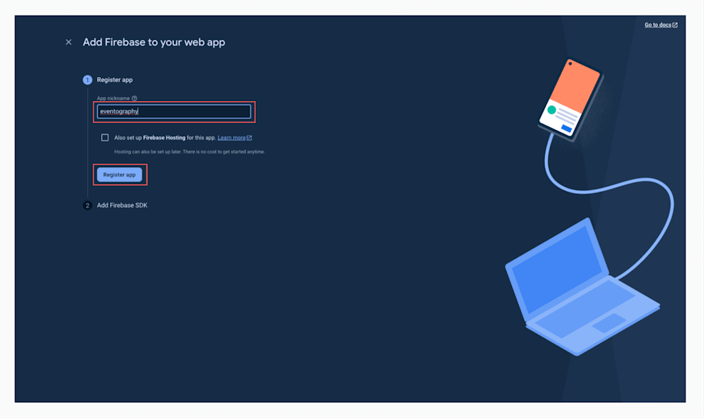 It’s now time to register your web application with Firebase. Enter the name of your application (remember to be consistent with your application name), then click Register app.