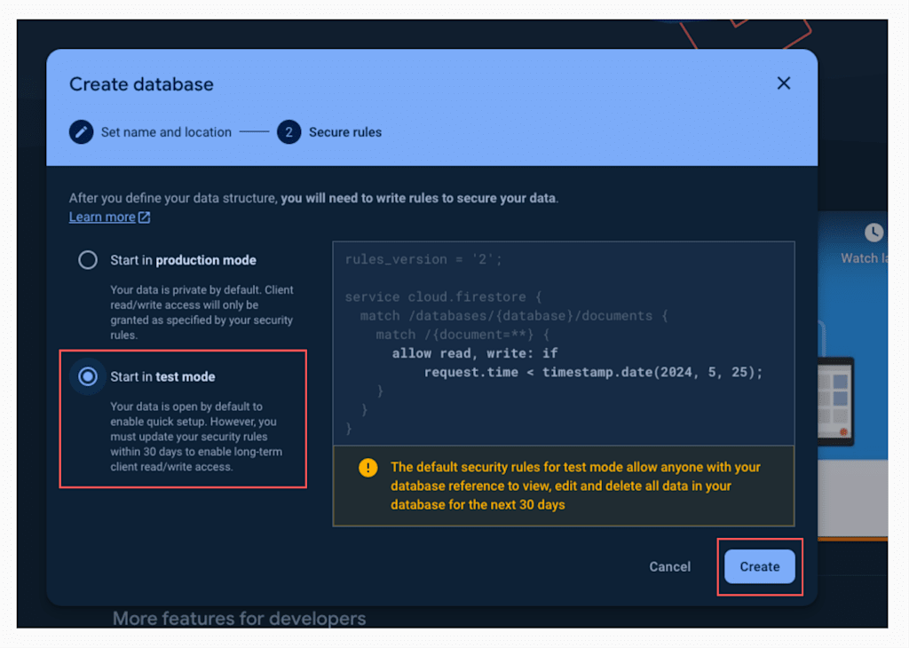 Click Start in test mode (make sure to come back and set the production mode after 30 days and update your security settings), then Create.