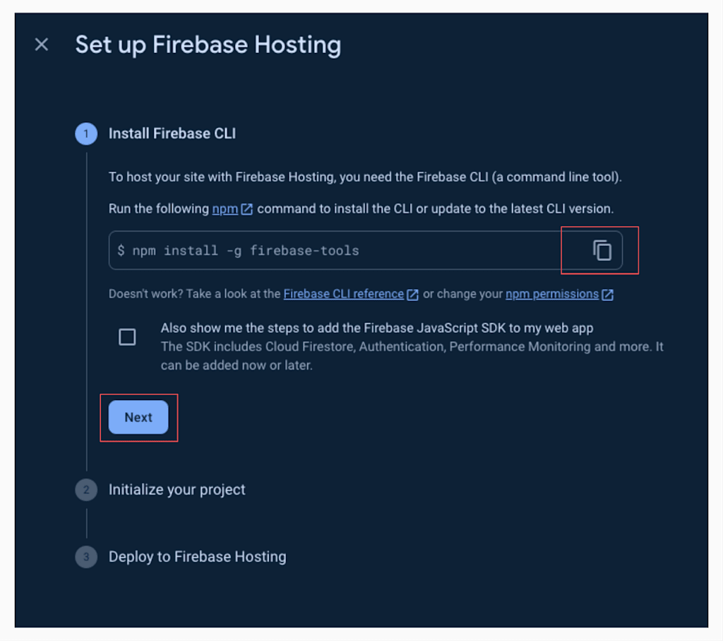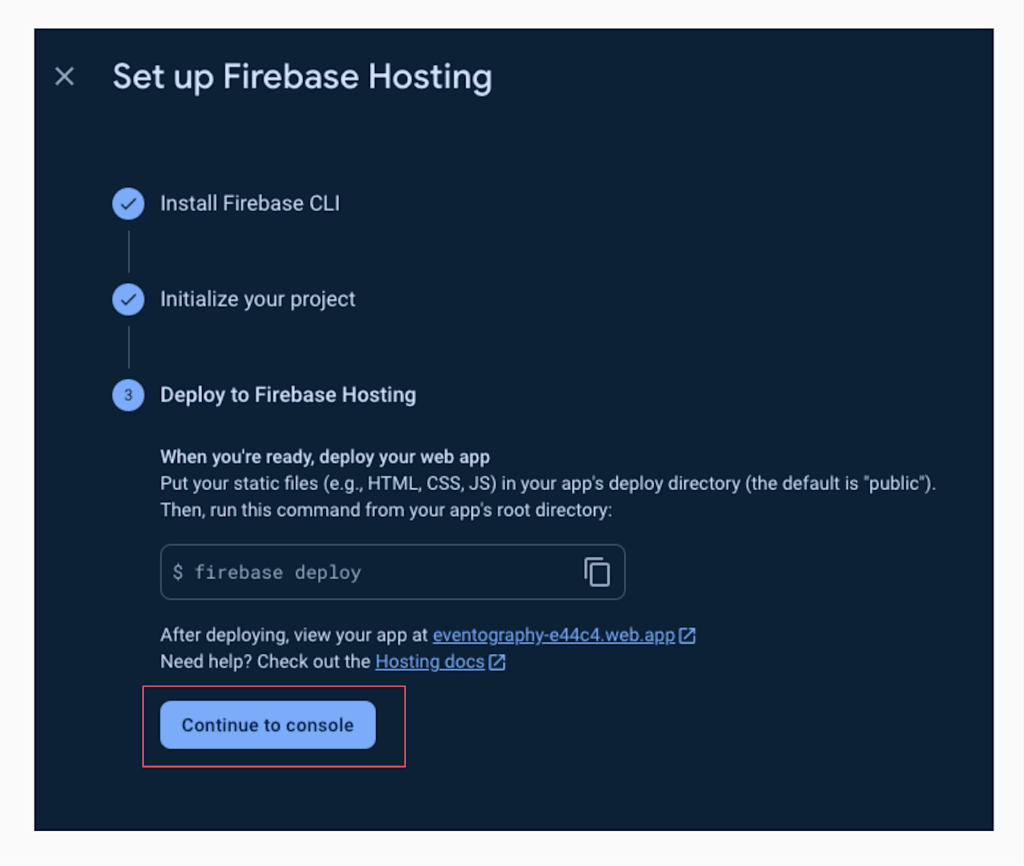 To deploy your app to Firebase Hosting, you can use the following command. We aren’t ready to deploy our app, but we will later on. Then click Continue to console.
