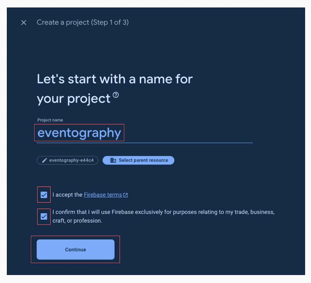 Give a name to your Firebase project. I named mine Eventography. Check the boxes and click Continue.