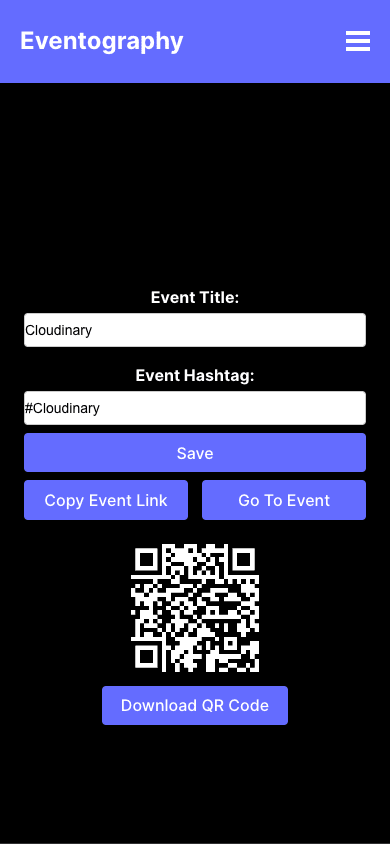 Log in to your app, navigate to the Profile page, and add a title and a hashtag to your event. Next, go to the Event page, click Upload Images, and select the images you want to upload. Once the images are successfully uploaded, you can navigate to the Gallery Page to view them. Lastly, you can also view them within your Cloudinary Cloud.