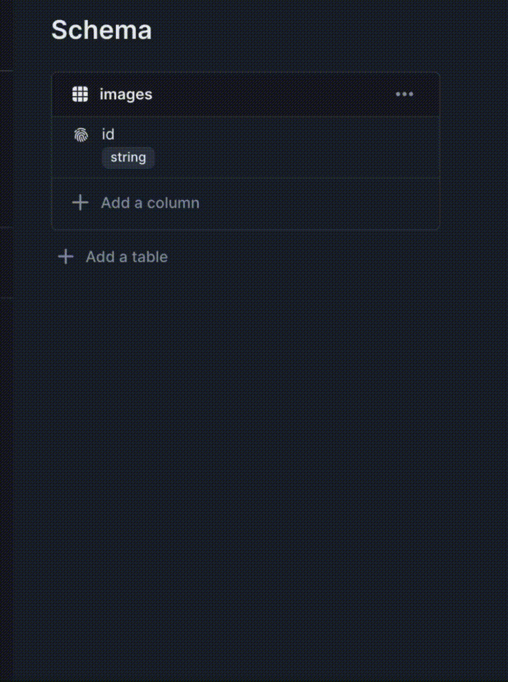 Let’s add a table. Click Add a table and name it “images”. Automatically, the new table has a column id. A unique id is generated for every record on a table.