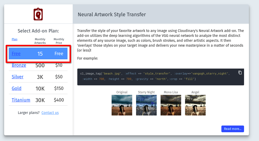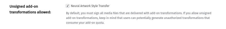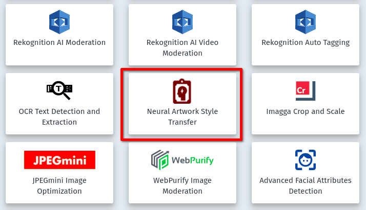Clicking on the tab above shows all the available add-ons on Cloudinary, from which we can choose the desired add-on, which in this case is the Neural Artwork Style Transfer add-on: