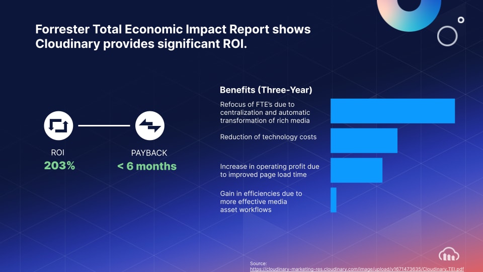 - Are you saving money in the long run? A future-proof visual media solution puts companies in position to save costs down the road. The 2023 Forrester Total Economic Impact Report also shows that an investment in Cloudinary will pay for itself within six months. Over a three-year period, customers will experience a 203% return on their investment. Additionally, companies see a reduction in technology costs and gain efficiencies due to more effective media asset workflows. With Cloudinary, developer teams can consolidate multiple technologies into one solution. Older solutions have feature set limitations, often footing customers with the bill to buy and maintain additional video tools separately.