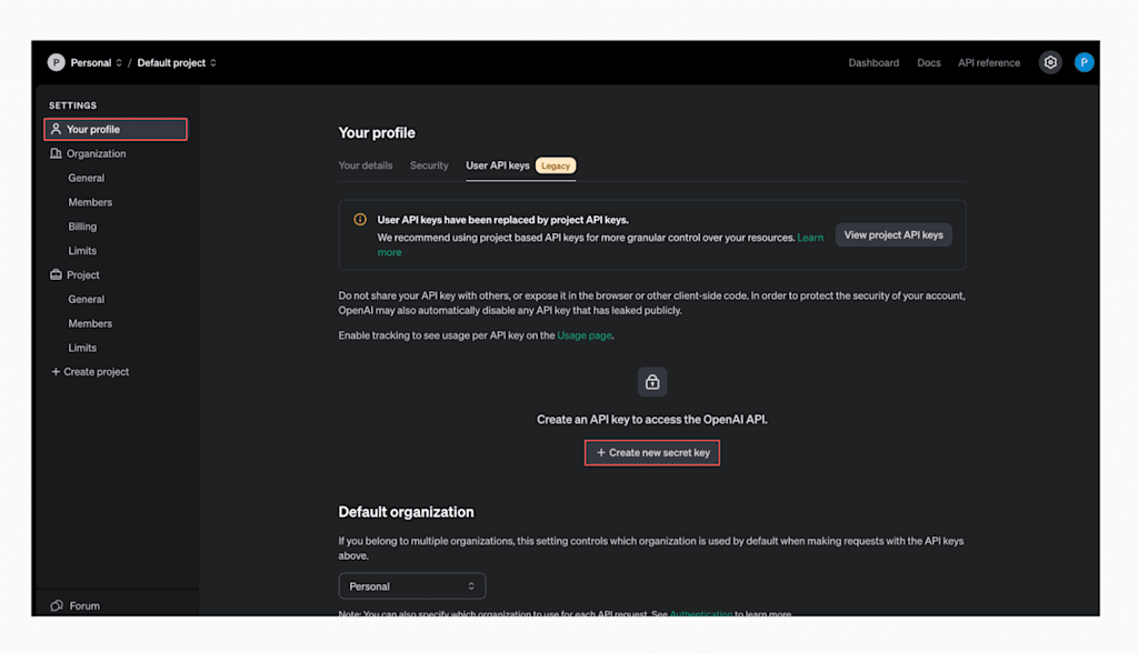Generate an API Key to be used on our backend server to use the OpenAI services. To do this, on your left navigation bar, click YourProfile, then click Create new secret key.