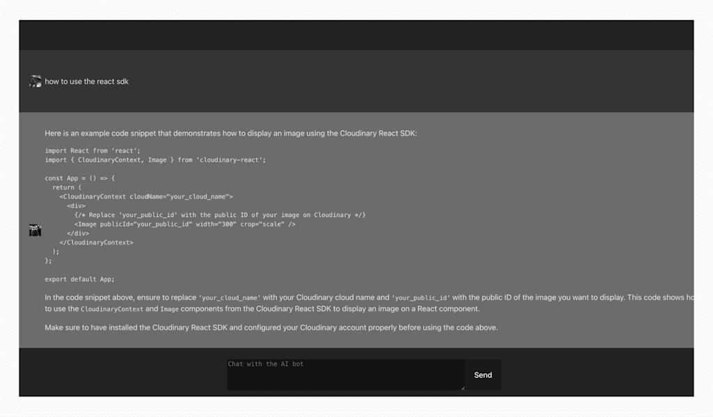 This is an example of an output of the app in which I ask how one can use the Cloudinary React SDK: