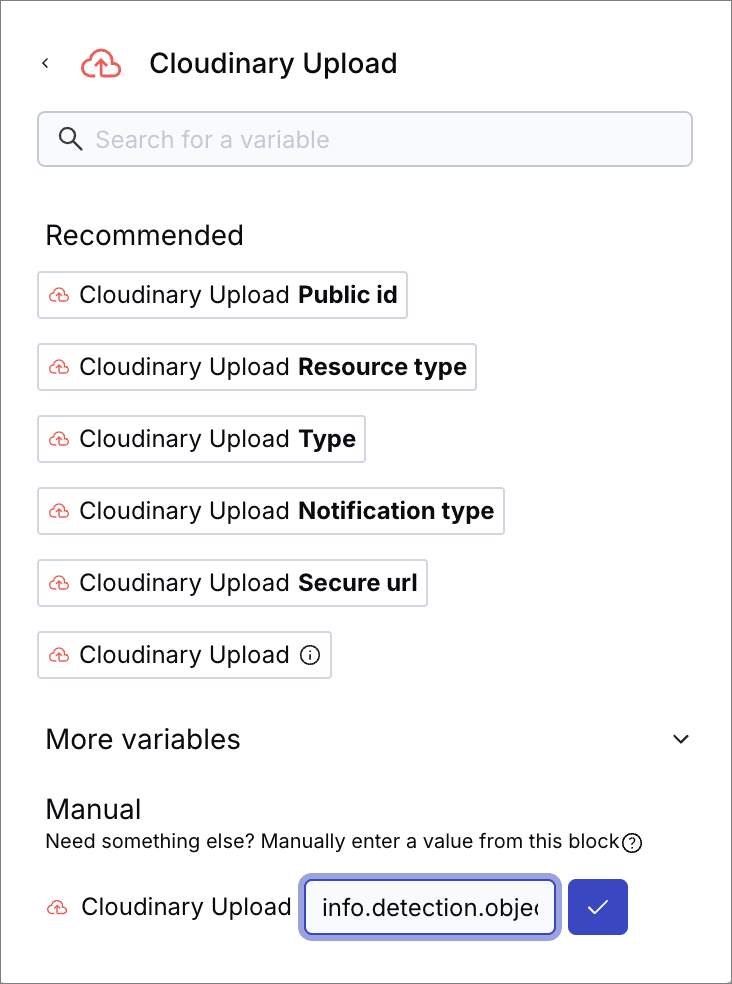 icon to insert a variable. The variable to insert equates to{{$.Cloudinary_Upload.result.info.detection.object_detection.data.watermark-detection.tags}}