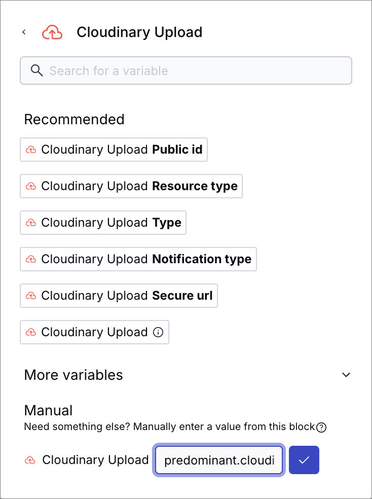 icon to insert a variable. The variable to insert equates to{{$.Cloudinary_Upload.result.predominant.cloudinary}}