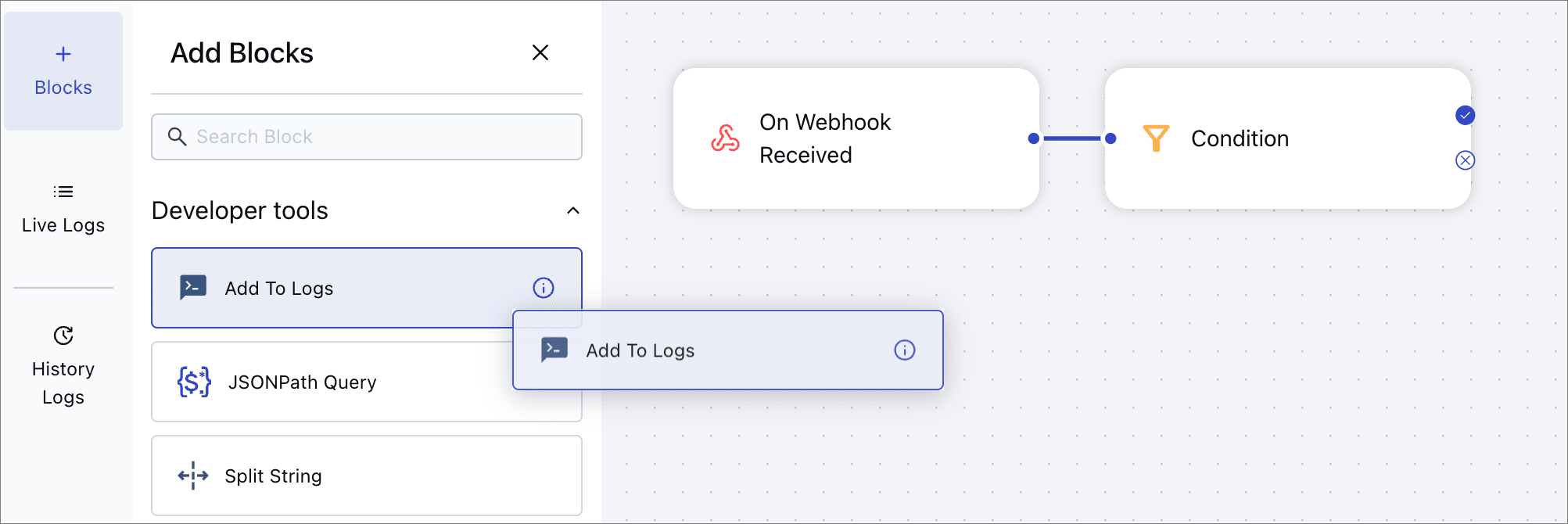 - From the Add Blocks sidebar, select the block you want to use and drag it to the canvas.