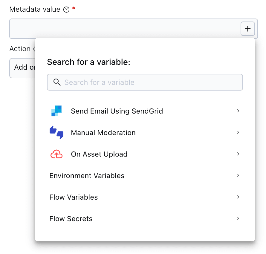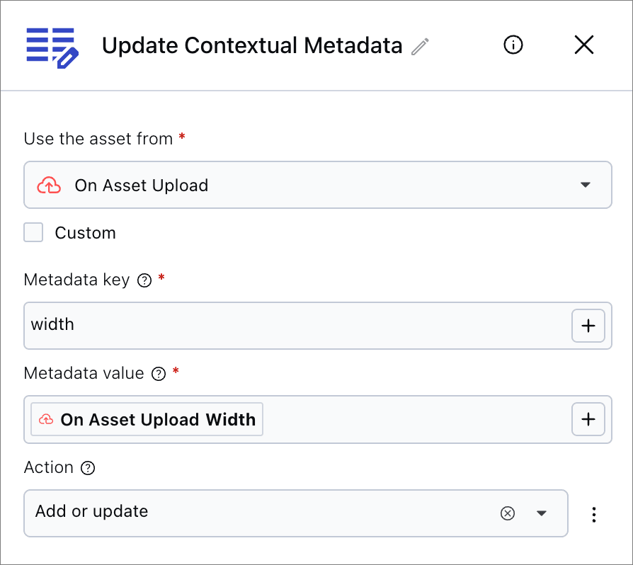 In the example below, the Metadata key field is a fixed value while the Metadata value field gets its value from the response of the On Asset Upload trigger block.