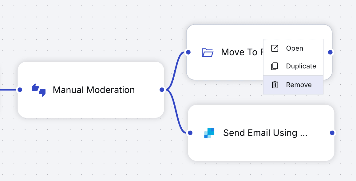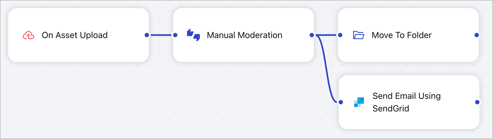 A block can be connected to multiple blocks. In the example below, once the Manual Moderation block executes successfully, both the Move To Folder and Send Email Using SendGrid blocks are executed in parallel.