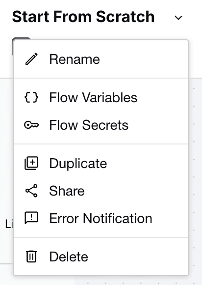 To set up an error notification, in the canvas, click the drop-down on the right side of your Flow name and click the Error Notification option (you can also find this option in the (3-dots) menu for the flow in the Flows page).