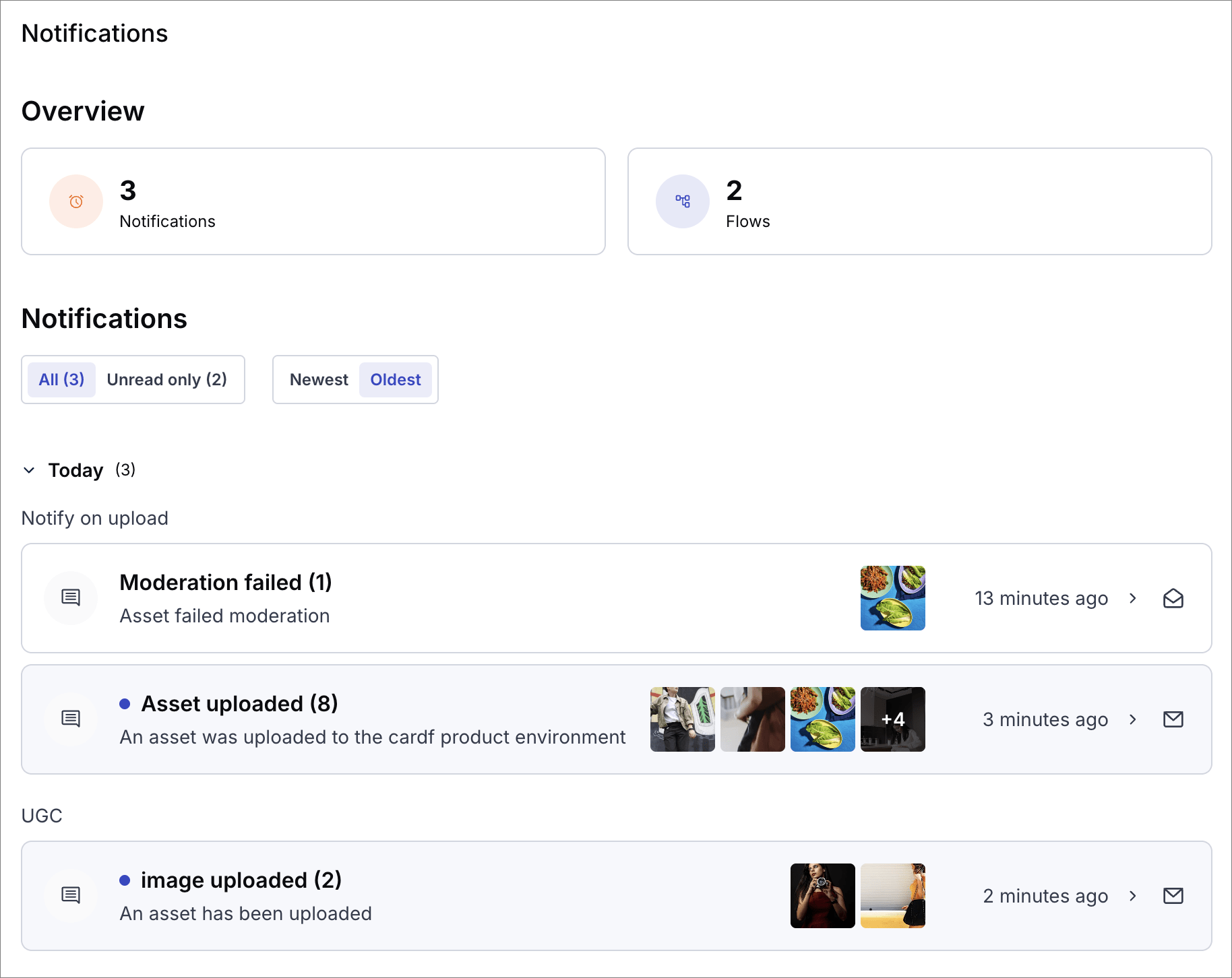 - A list of notifications grouped by flow and block, with the notification title, description, and asset thumbnails