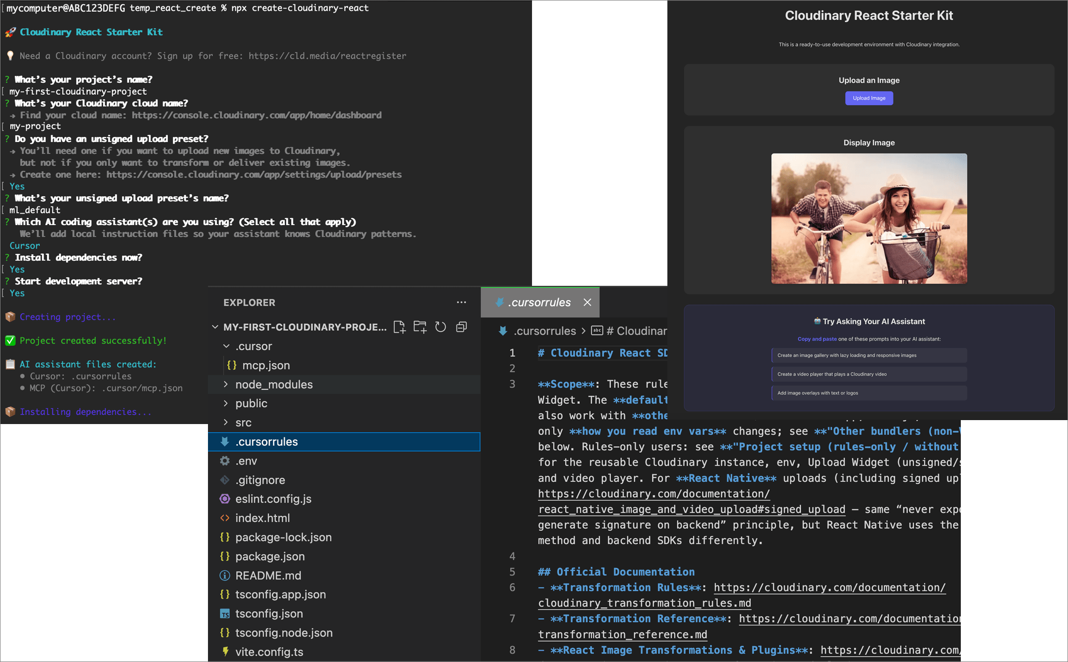 This CLI guides you through setup, configuring your Cloudinary credentials, and optionally installing AI assistant configuration files for tools like Cursor, GitHub Copilot, and Claude. Use it as an AI-assisted playground to explore the React SDK, widgets, and players, or as a starting point for your next project. If you're not sure where to begin, the copyable prompts in your generated 'app' are a great place to start.