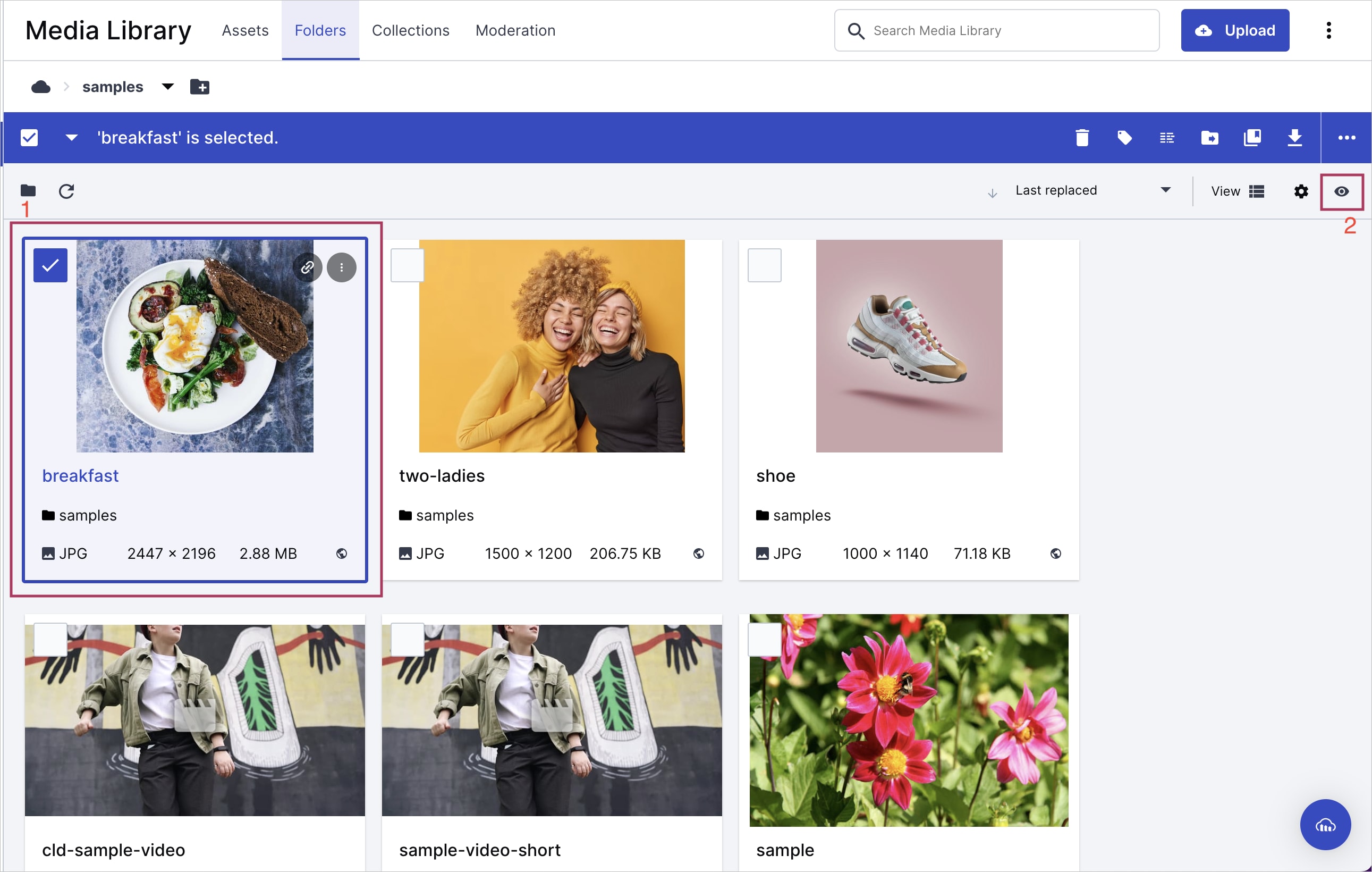 - Select the asset and click the previous icon (eye) in the upper-right hand corner of the Media Library and under the assets toolbar.