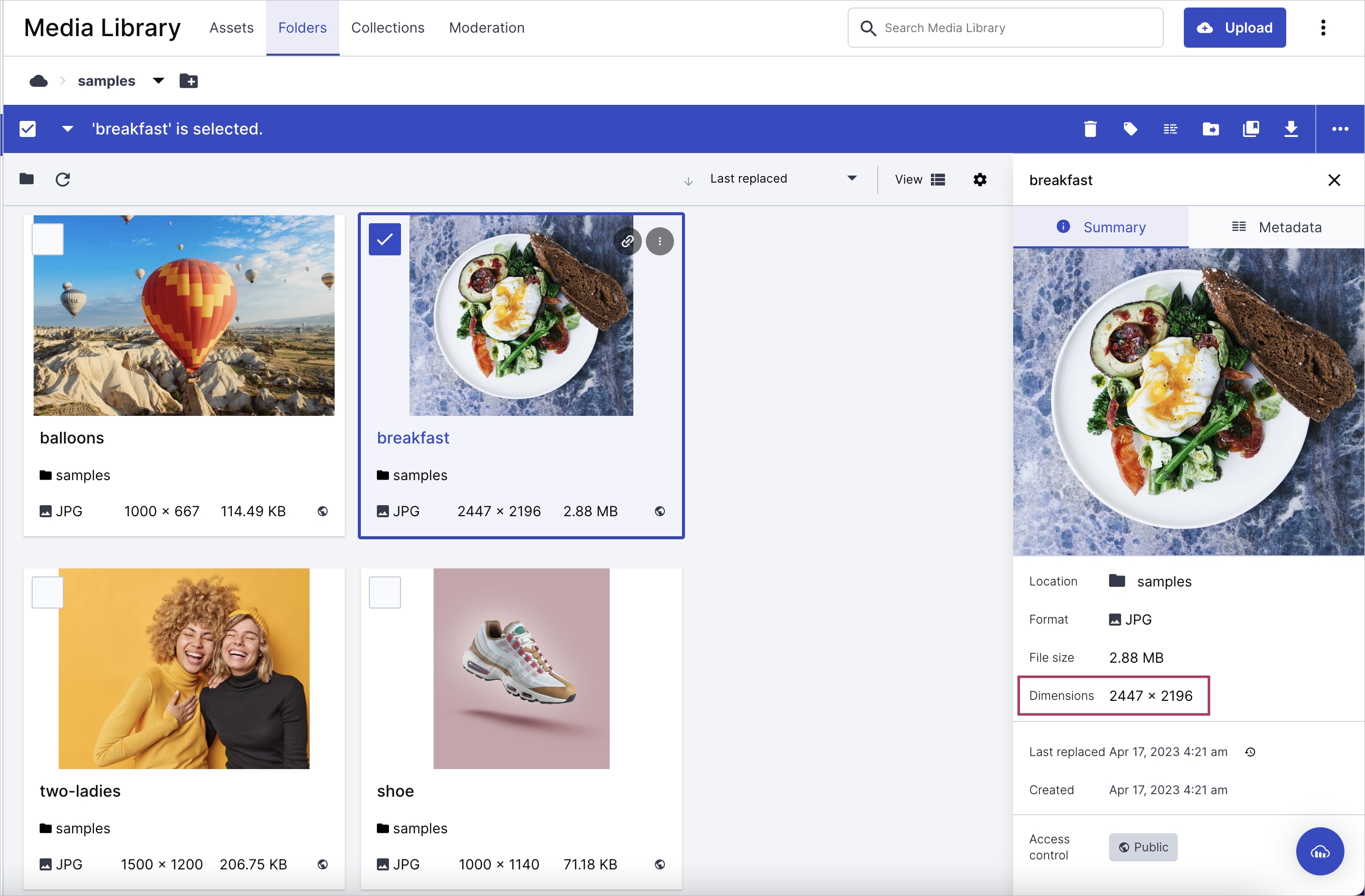 - View the asset dimensions in the Summary tab of the Preview Pane.