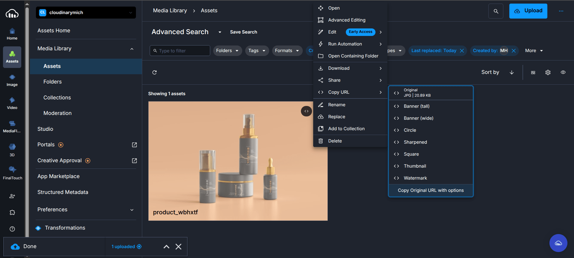 First, you’d need to upload the image to your Cloudinary product environment. Once it’s uploaded, click on the ellipsis icon on the image, then go to Copy URL > Copy Original URL with options:
