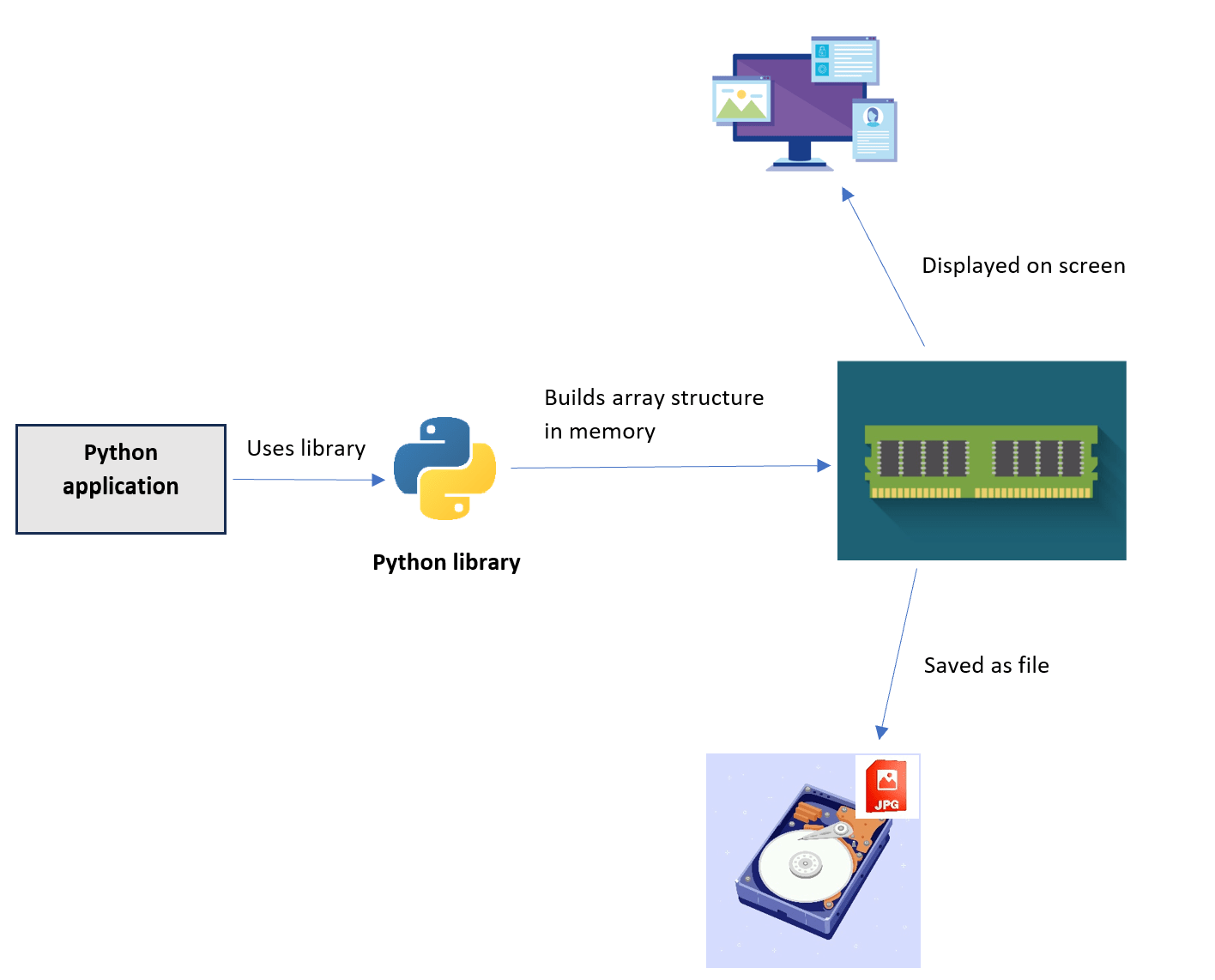 Python includes different libraries for image processing that help create images programmatically. To create an image, you initialize the data structure (like a NumPy array) with the image data with pixel values, then you use these libraries to read this data.