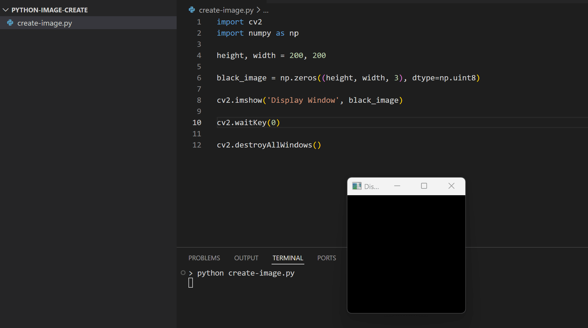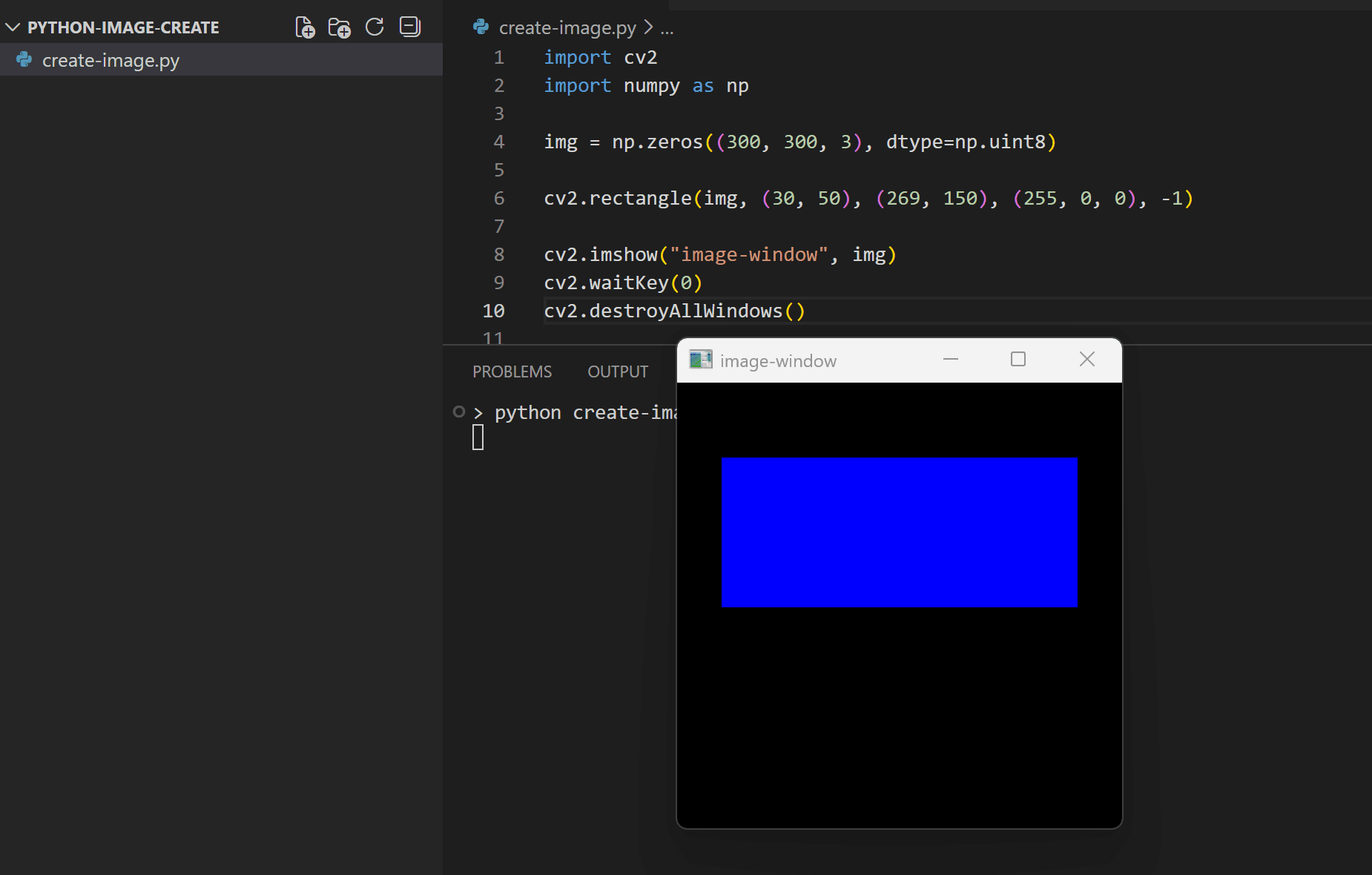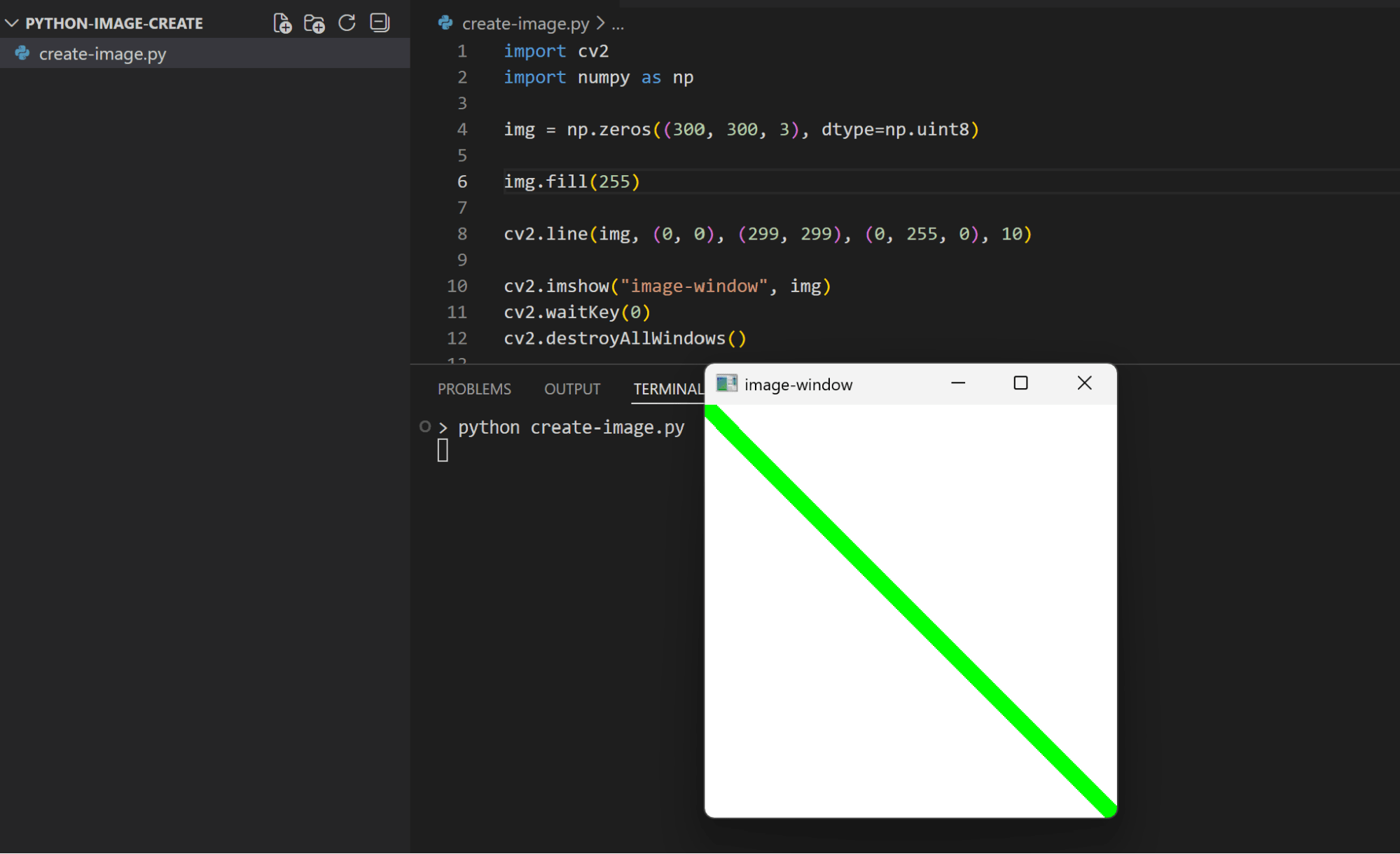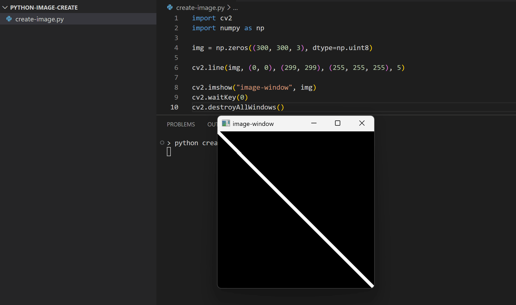This command will install the OpenCV library which will automatically include NumPy. We can then create an image and display it with the following code:
