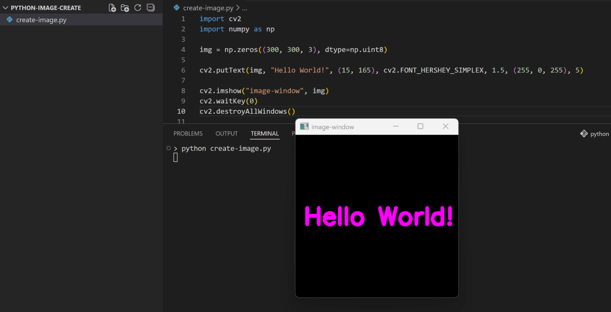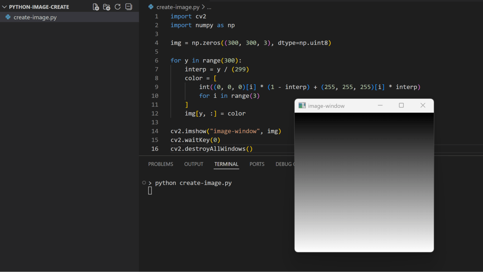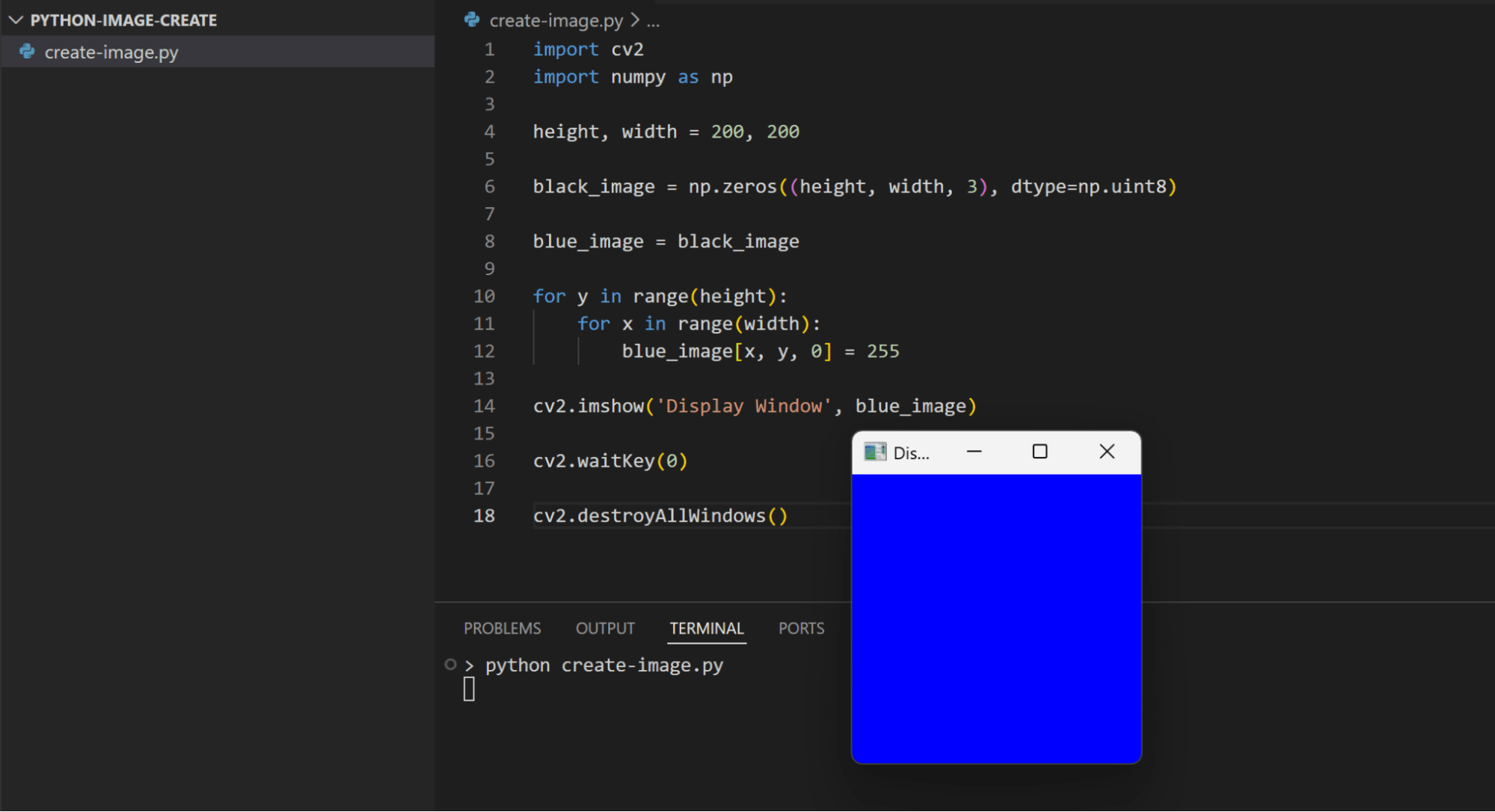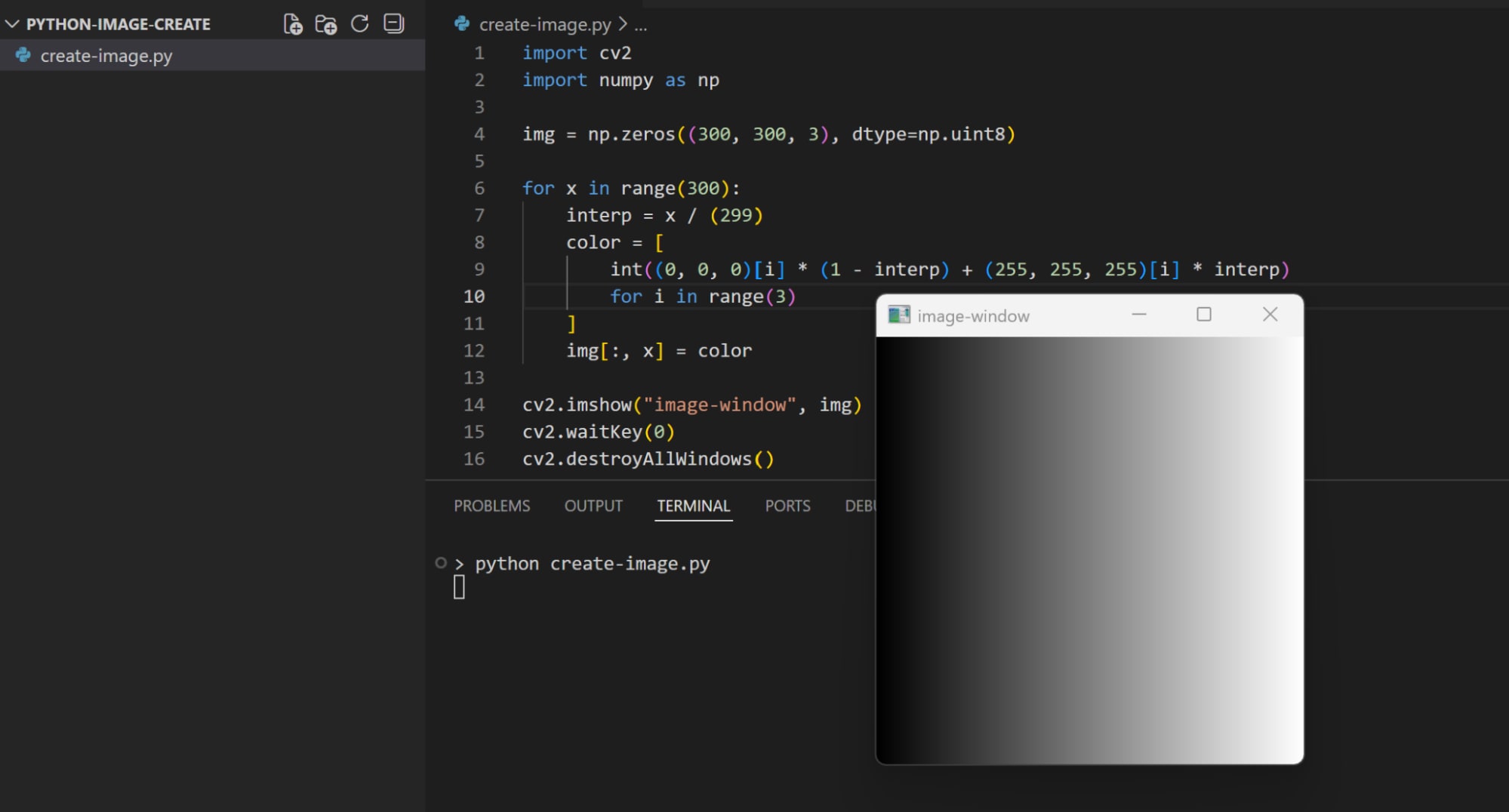 This command will install the OpenCV library which will automatically include NumPy. We can then create an image and display it with the following code: