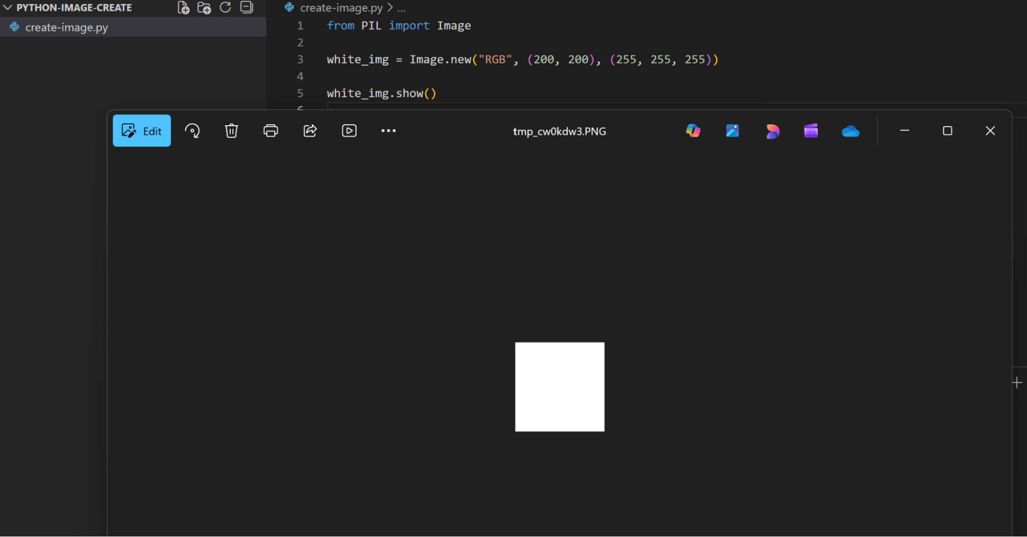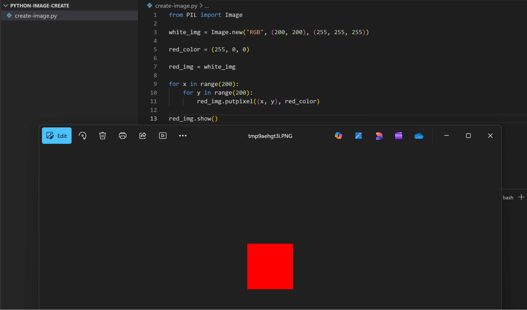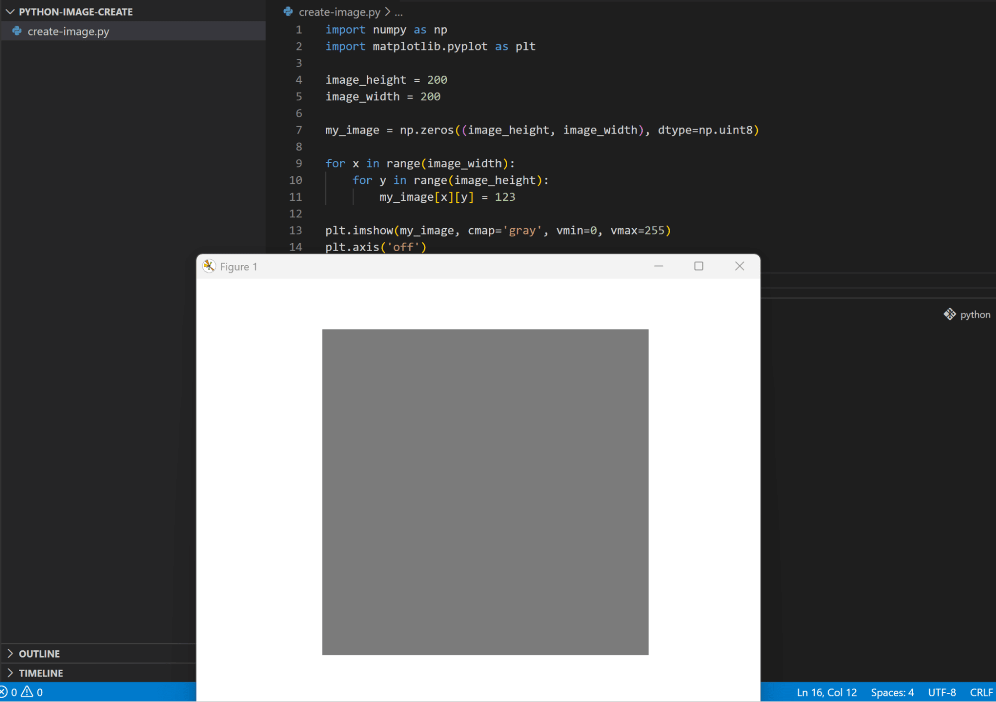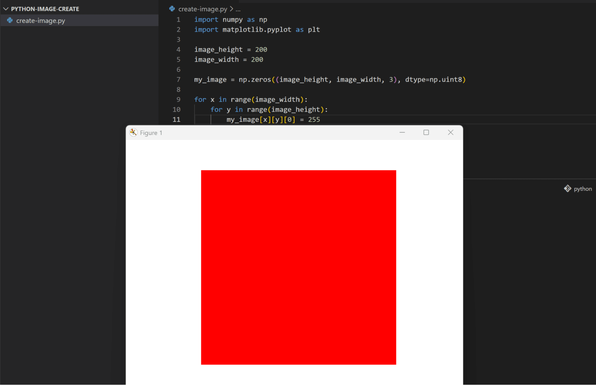 Creating an image in Python is the process of generating these values in memory using Python code. We can then view their corresponding visual representation of the image on the screen, or save it as an image file on persistent storage.