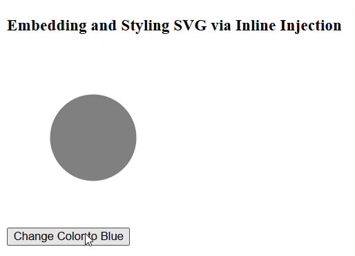 <body> <h3>Embedding and Styling SVG via Inline Injection</h3> <div id="svgContainer">Loading SVG...</div> <button id="colorBtn" disabled>Change Color to Blue</button> <script> const svgContainer = document.getElementById('svgContainer'); const colorBtn = document.getElementById('colorBtn'); fetch('https://res.cloudinary.com/your-cloud-name/image/upload/fl_sanitize/circle.svg') .then(response => response.text()) .then(svgText => { svgContainer.innerHTML = svgText; colorBtn.disabled = false; // enable button once SVG is injected }) .catch(err => { svgContainer.textContent = 'Failed to load SVG.'; console.error(err); }); colorBtn.addEventListener('click', () => { const circle = document.getElementById('myDot'); if (circle) { circle.setAttribute('fill', 'blue'); } }); </script> </body>