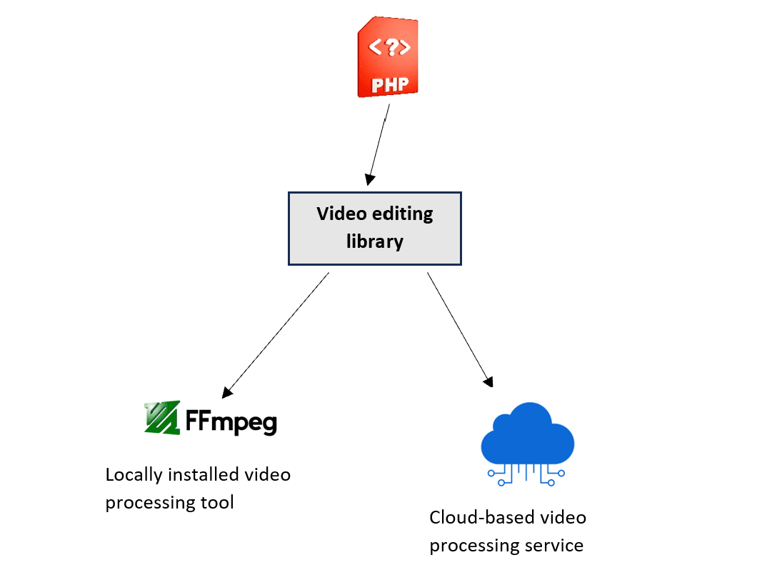Because PHP itself isn’t designed for media creation and processing, what these libraries actually do is provide access to external services or tools that implement the video processing capabilities. They are wrappers that act as interfaces for accessing the features provided by these external services. These external services can be a video editing tool that’s hosted on a local infrastructure, or a cloud-based service that offers APIs and SDKs for integration.