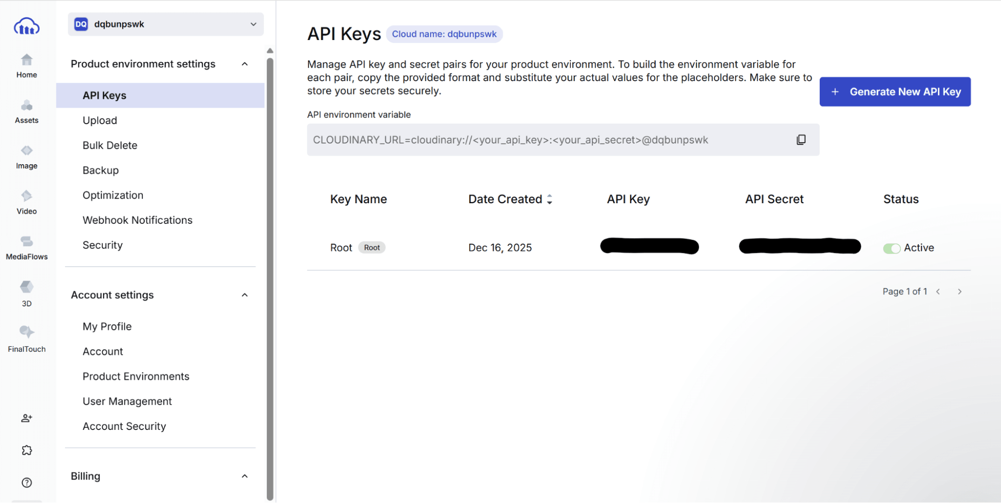 You’ll also find the CLOUDINARY_URL API environment variable structure displayed. Copy this and replace <your_api_key> and <your_api_secret> with the information from your generated API key.
