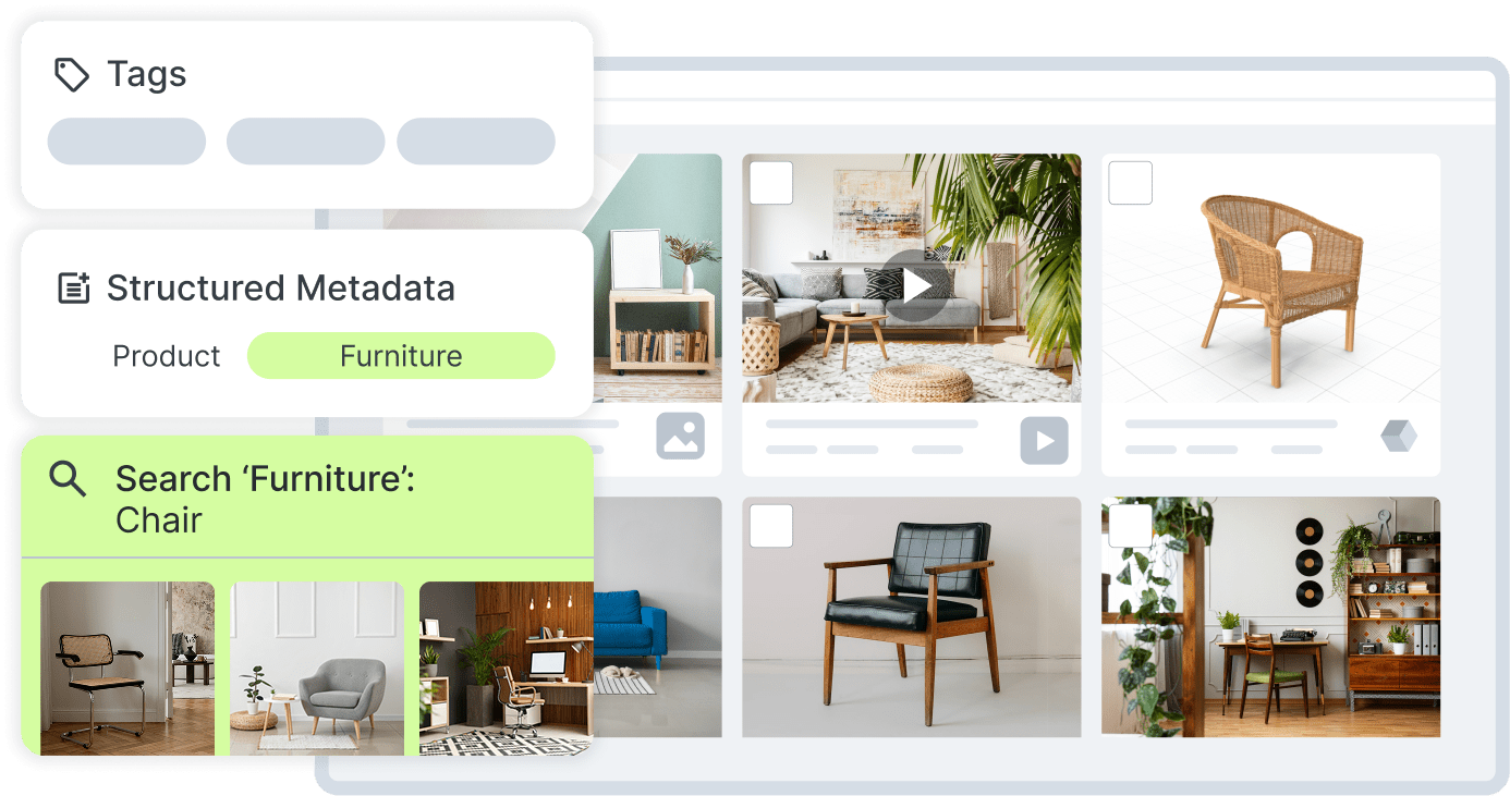 Upload, organize and manage metadata for all your 3D assets alongside images, videos in one place. Use AI-powered tags and metadata to boost search performance.