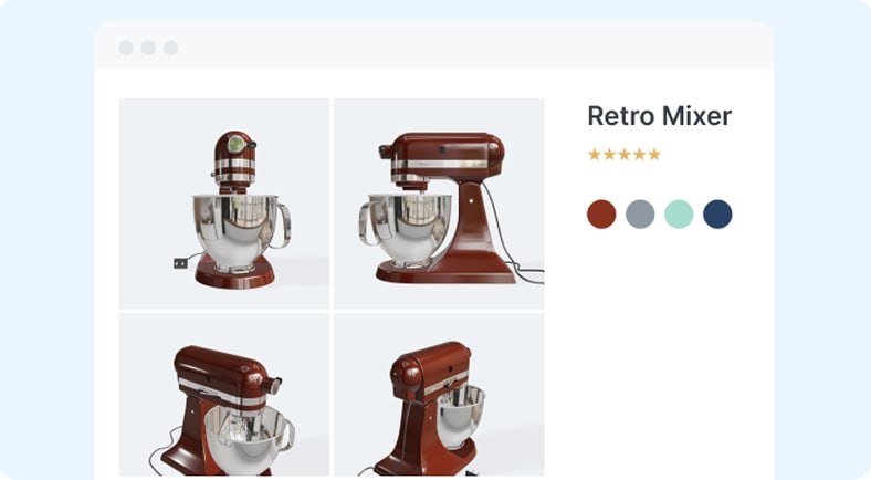 Use API and simple URL-based parameters to convert a single 3D model into various 3D formats or multiple 2D images to showcase a product in various angles.